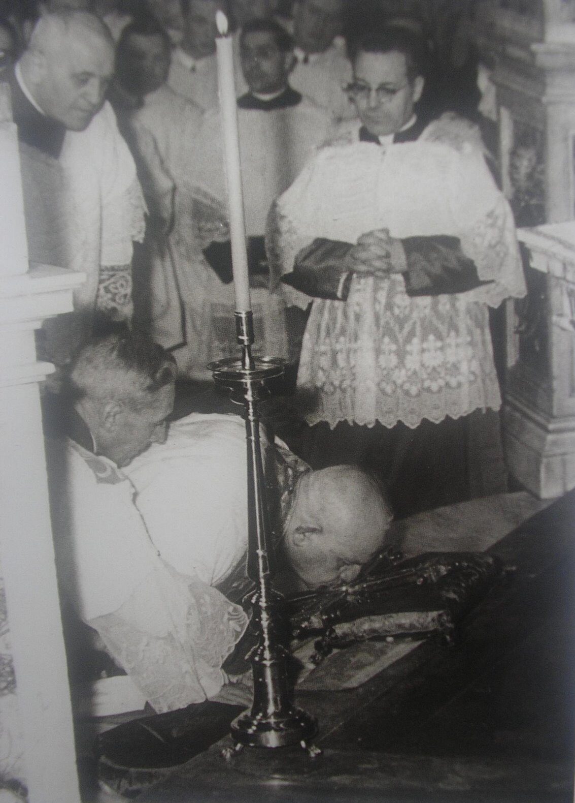 Papież Jan XXIII adorujący leżący na stopniach ołtarza relikwiarz Krzyża Świętego w czasie liturgii Wielkiego Piątku w rzymskiej Bazylice Świętego Krzyża w Jerozolimie. Ten sposób adoracji wskazuje, że przynajmniej ta ceremonia przebiegła w całości lub części według przepisów sprzed reformy Wielkiego Tygodnia Piusa XII.