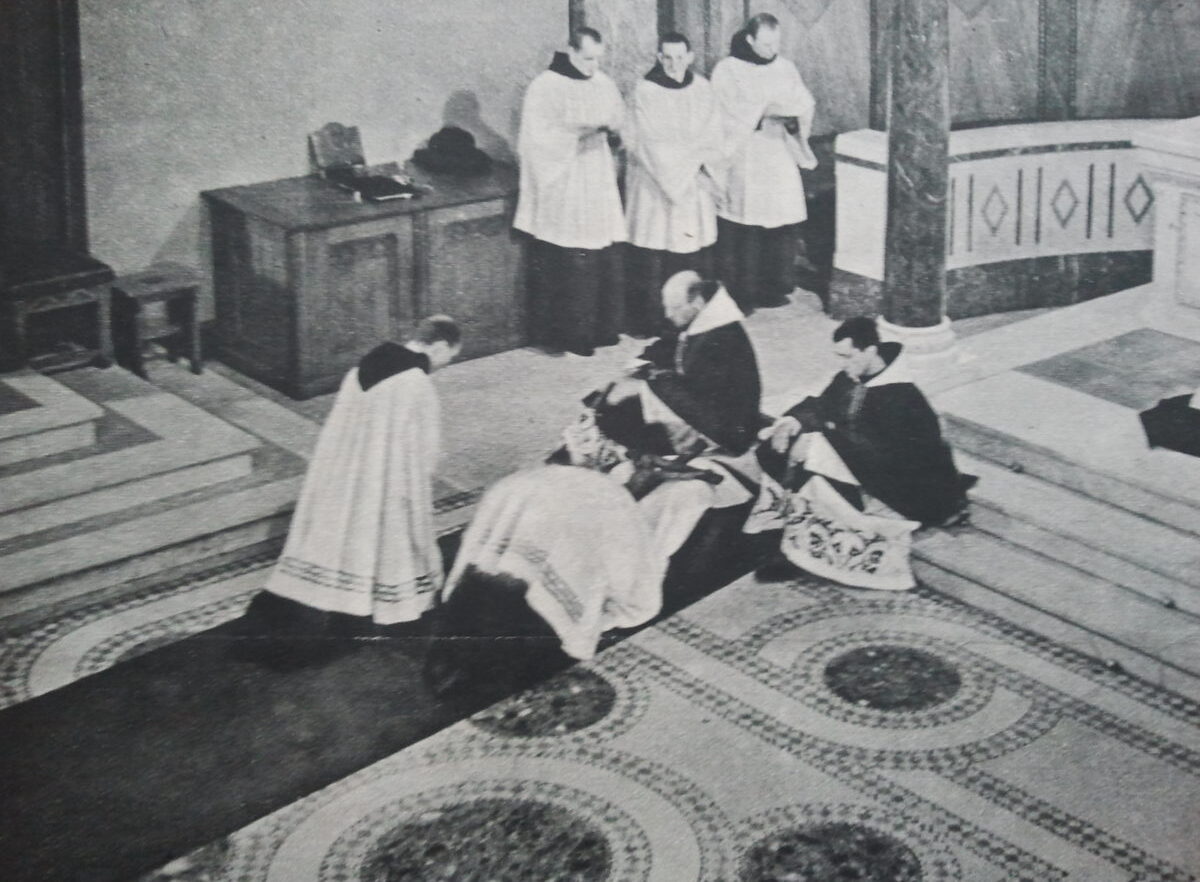 The adoration of the Cross on Good Friday in the Belgian Benedictine Abbey of St. Andrew in Bruges, A.D. 1935. Next to the cross, lying on the steps of the altar on the Gospel side, one can see a deacon and subdeacon in folded chasubles. The photo by the courtesy of the Author of the blog Adventures In Keeping House.