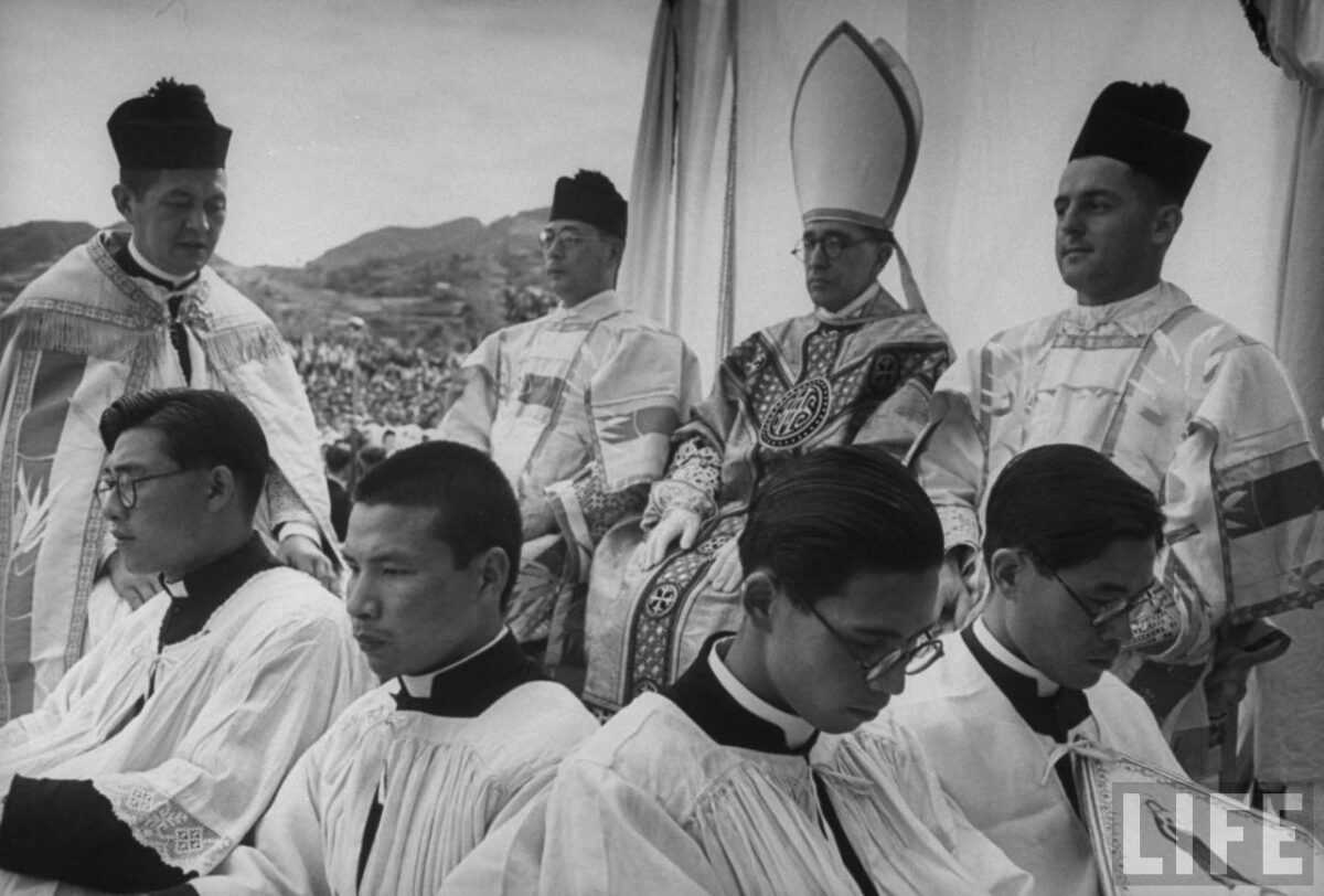 Uroczysta Msza Święta pontyfikalna celebrowana przez biskupa Nagasaki, Pawła Aijirō Yamaguchi, na ruinach katedry Niepokalanego Poczęcia Najświętszej Marii Panny, zniszczonej przez wybuch amerykańskiej bomby atomowej zrzuconej na miasto 9 sierpnia 1945 r. Liturgia sprawowana była w czerwcu 1949 r. z okazji 400. rocznicy przybycia do Japonii św. Franciszka Ksawerego. Warto odnotować, że stojący przed stopniami tymczasowego ołtarza diakoni honorowi ubrani są w alby, a nie komże czy rokiety.