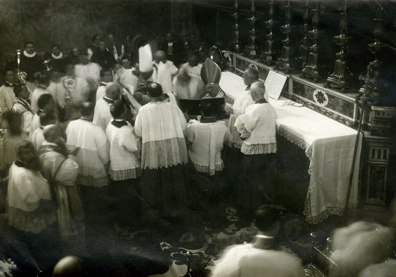 Sakra biskupia Adama Stefana Sapiehy, Piusa Armanda Piotra Sabadela O.F.M. Cap. i Kajetana De Lai dokonana przez papieża Piusa X w Kaplicy Sykstyńskiej, 17 grudnia 1911 r. [źródło zdjęć]. Zgodnie ze zwyczajem i w związku z długością takiej ceremonii, święceń episkopatu papież udzielał w czasie mszy recytowanej, lecz pomimo tego ubrany był w pełen zestaw szat pontyfikalnych. Po stronie Epistoły dostrzec można ferulę opartą o predellę ołtarza: do czasów Pawła VI była to jedna z nielicznych okazji, gdy można było zobaczyć ją w użyciu podczas kaplic papieskich.